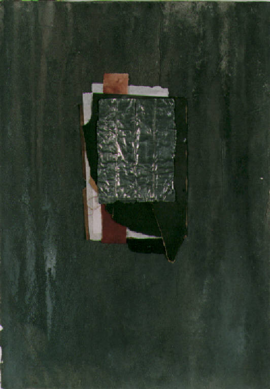 Al centro dello spazio compositivo è costituito da un collage di carte e materiali vari sovrapposti a forma di libro. Il colore è tonale, freddo (grigio), caldo (rosso).
