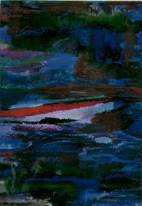 Lo spazio compositivo è interamente riempito da colore/ luce azzurro.\nIl colore è tonale, ferddo (bleu, azzurro, viola). Stesura: veloce.\nLa linea è grossa e modulata.
