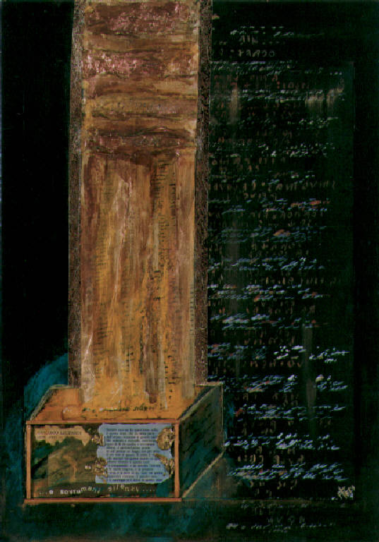 In basso a sinistra c'è un sarcofago con poesia di Leopardi da cui esce una luce solare che procede verso l'alto.\nIl colore è tonale, caldo (giallo, ocra); acromatico (nero).\nLa stesura è stratificata. I segni scrittura sono orizzontali, manuali, a stampa.