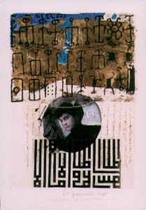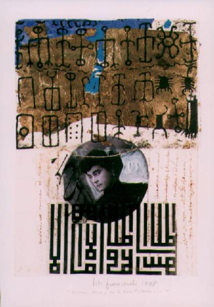 Al centro dello spazio compositivo c'è una fotocopia in bianco e nero a mezzo busto di una figura femminile; in alto segni-scrittura su fondo oro; in basso segni geometrici regolari alternati a scrittura d'oro.\nIl colore è freddo (oro) e acromatico (nero, grigio). Stesura: stratificata.\nSegno scrittura (manuale, ideogramma).