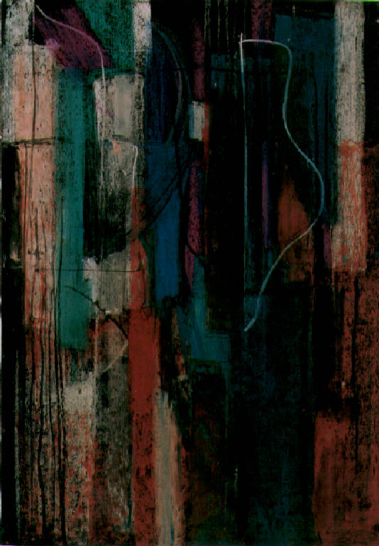 L'intero campo compositivo è ritmato attraverso l'intervento di fasce cromatiche verticali. Il colore è tonale; freddo (blu, grigio, verde). La stesura è stratificata.