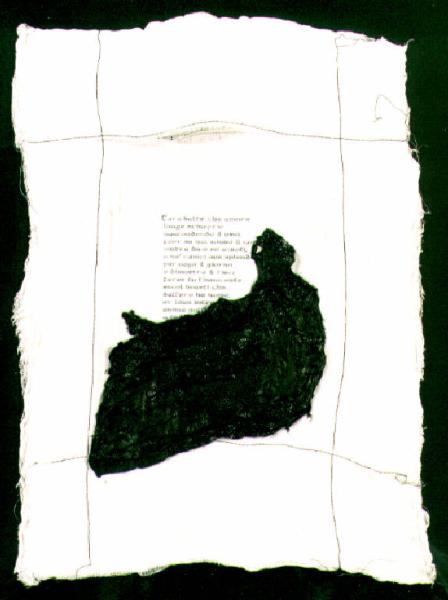 Al centro dello spazio compositivo c'è il testo con caratteri a stampa di una poesia di Leopardi parzialmente coperto da un drappo nero a rilievo.