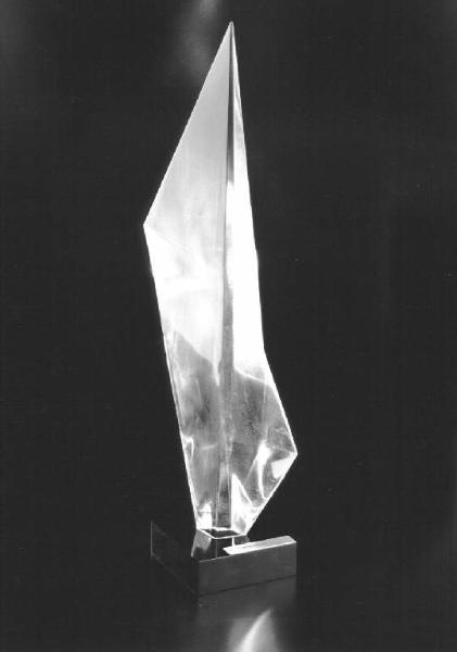 Opera a tutto tondo di forma poligonale acuminata in punta, di plexiglas trasparente e nero nella base.