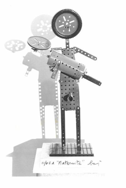 Opera a tutto tondo costituita da pezzi di meccano colorato, in modo da formare una madre con in braccio un bambino.