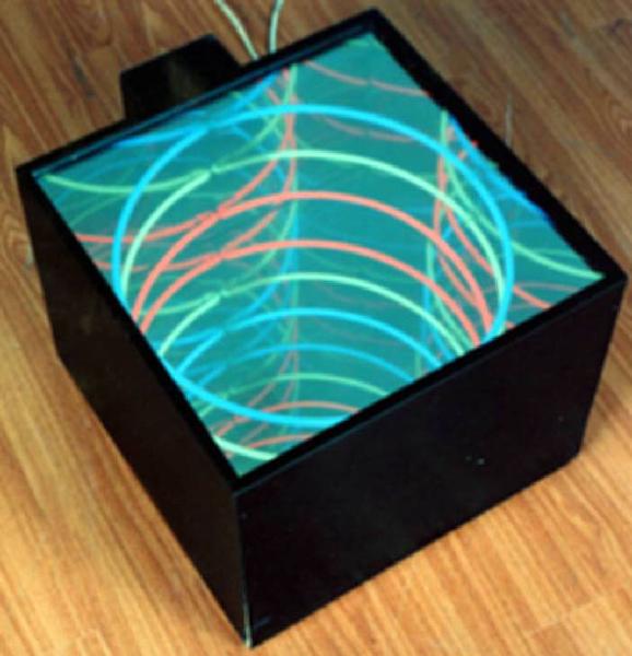 Scatola di forma cubica in legno nero rivestita internamente, su tutti i lati da specchi e contenente tubi circolari di neon colorati. La scatola ha anche un coperchio in legno. Il neon si accende tramite interrutore collegato all'opera.