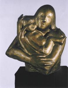 Mezzo busto a tutto tondo in bronzo dorato, rappresenta una mamma che abbraccia il suo bambino.