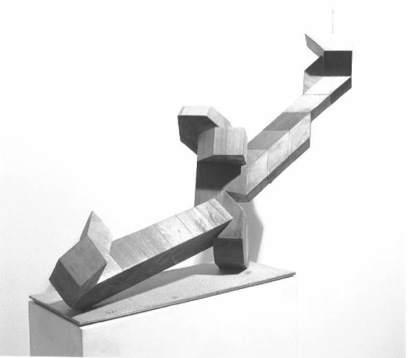 Opera a tutto tondo costituita da moduli rombolidali di legno che uniti insieme a lisca di pesce formano un drago stilizzato.