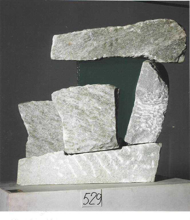 Opera a tutto tondo polimaterica, con una parte centrale in lastre di cristallo e una cornice in pietra.