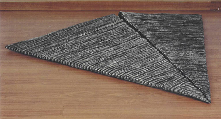 Opera a tutto tondo di colore grigio a forma piramidale.