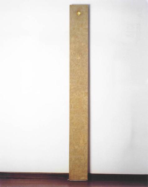 Tavola di cera verticale con scritte di segni antichi, come antiche tavolette, in alto impronta d'uovo dorata.
