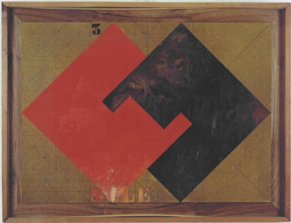 L'opera presenta al centro due quadrati uno rosso e uno nero intrecciati. Sullo sfondo disegni a matita geometrici a quadrati. In alto a destra c'è il numero 3, in basso, a lettere capitali, c'è scritto Sole.