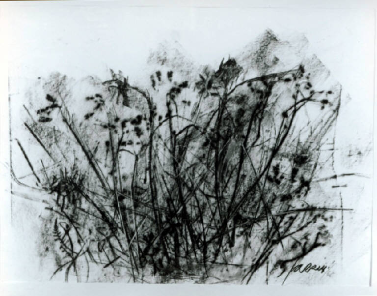 Opera realizzata a carbone su carta. L'intero spazio compositivo è occupato da un groviglio di arbusti e fiori di campo.