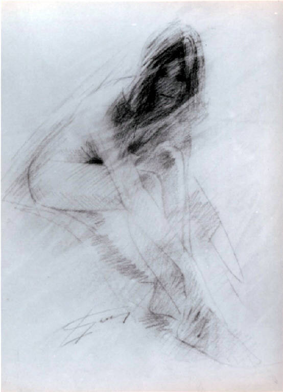 Opera su carta che rappresenta una giovane donna nuda seduta. Il busto è chinato verso le ginocchia e le mani vanno a toccare piedi; il volto, realizzato con un segno piu' deciso che va a definire meglio i tratti, è rivolto allo spettatore.