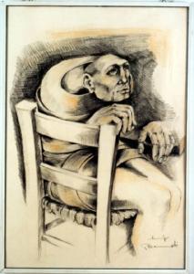 Opera a tecnica mista che rappresenta un uomo seduto su una sedia di legno; la mano sinistra è appoggiata al tavolo. L'uomo è come avvolto da una fascia rigida, il suo volto ha tratti spigolosi e ben definiti, i suoi occhi sono rivolti verso l'alto.