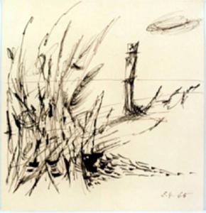 A sinistra della composizione in primo piano un alto cespuglio; piu' al centro in secondo piano si vede un uomo caratterizzato da forme squadrate e rigide. Dietro di lui un segno grafico in cielo a simboleggiare una nuvola. Questo susseguirsi di componenti determina un senso prospettico.