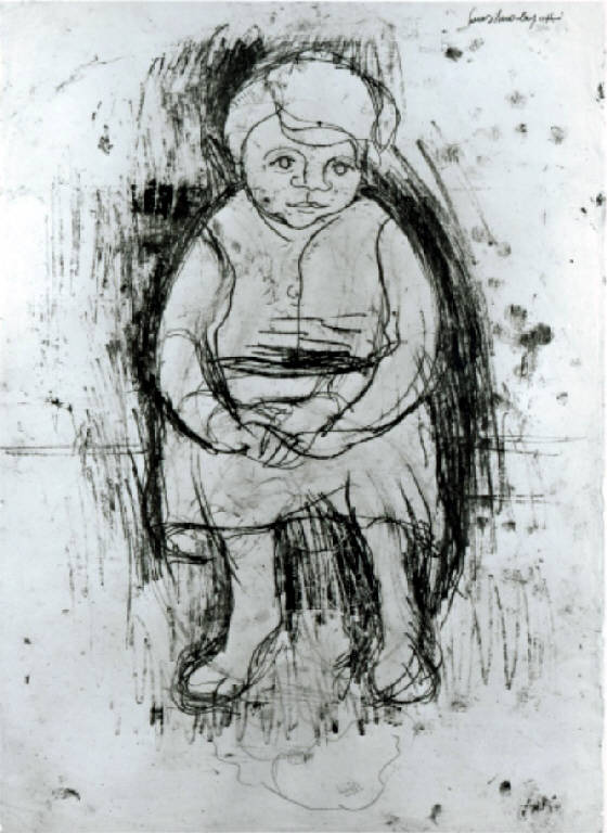 Opera a china che rappresenta una bambina seduta; sguardo dolce e mani intrecciate sulle ginocchia.