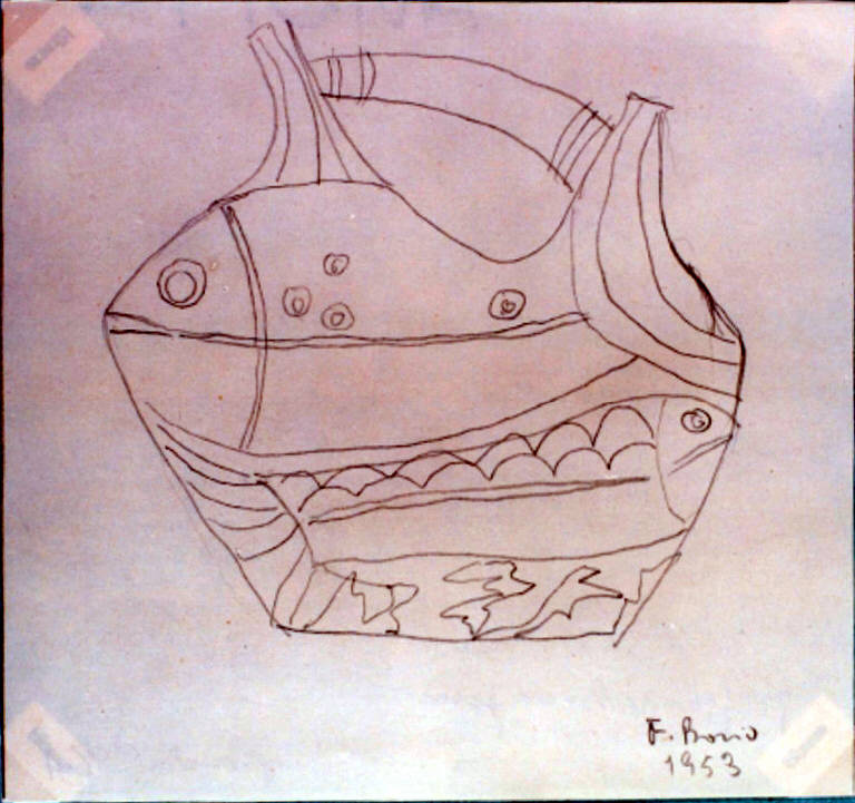 Disegno a matita di un progetto per un vaso caratterizzato dalla decorazione a forma di due pesci posti uno sopra l'altro.\n.