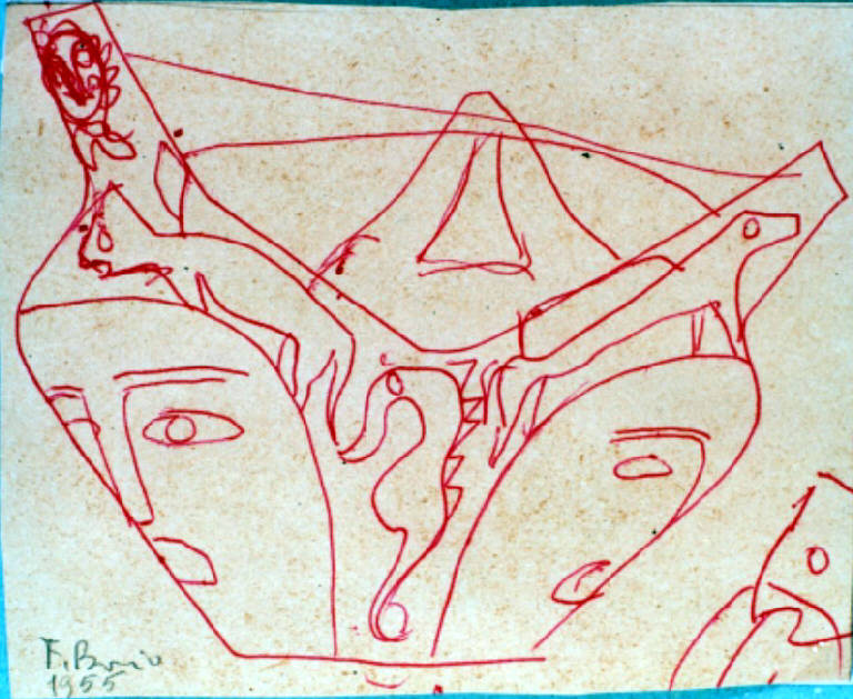 Progetto per un vaso decorato con due volti donna di profilo e piccoli animali semplificati.\n\n\n.