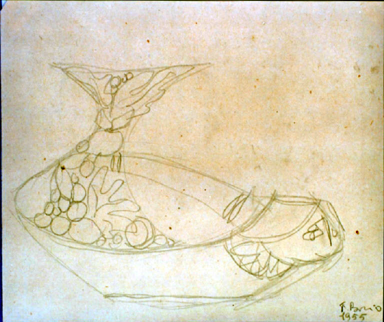 Progeto di una brocca che presenta come decorazione una testa di donna, schizzata a matita velocemente, e frutta al lato opposto.\n\n\n\n\n\n.