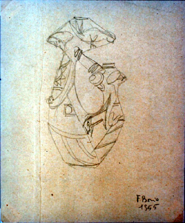 Progetto per una brocca decorata con forme fortemente stilizzate; leggibili però due figure umane e due animali.\n\n\n.