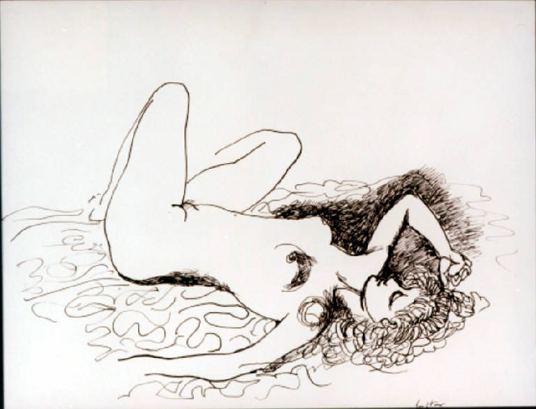 Disegno a china che ritrae un donna nuda sdraiata con le gambe flesse, il braccio sinistro disteso mentre quello destro piegato. Viso incorniciato da folti e mossi capelli.