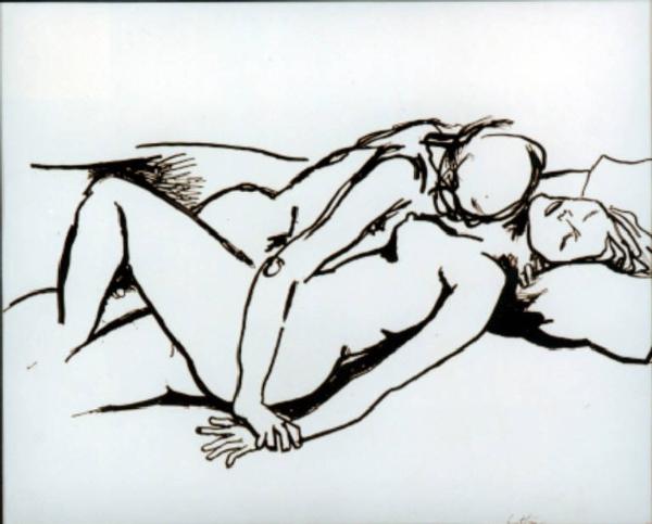 Opera a china che rappresenta una coppia di amanti nudi distesi. La donna ha la testa appoggiata ad un cuscino e la gamba sinistra piegata. L'uomo le sorregge il collo con una mano e con l'altra le tiene il braccio sinistro teso e fermo.