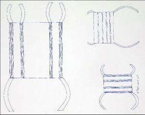 Composizione di forme astratte costituita da un elemento a sinistra e da due elementi piu' piccoli posti l'uno sopra l'altro.