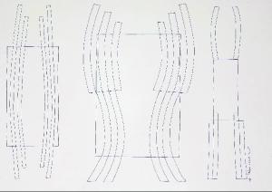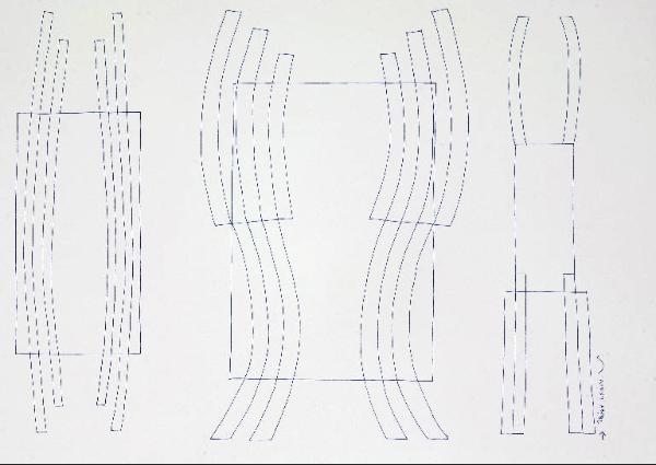 Composizione di forme astratte costituita da tre elementi che si sviluppano verticalmente. Quello al centro risulta di dimensioni maggiori.