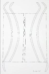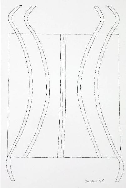 Composizione di forme astratte caratterizzata da un grande elemento rettangolare diviso al centro da linee verticali.