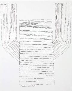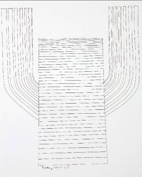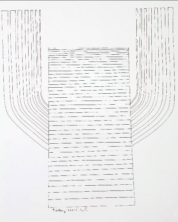 Composizione caratterizzata da un grande rettangolo con linee parallele orizzontali al suo interno e con ai lati elementi curvilinei.