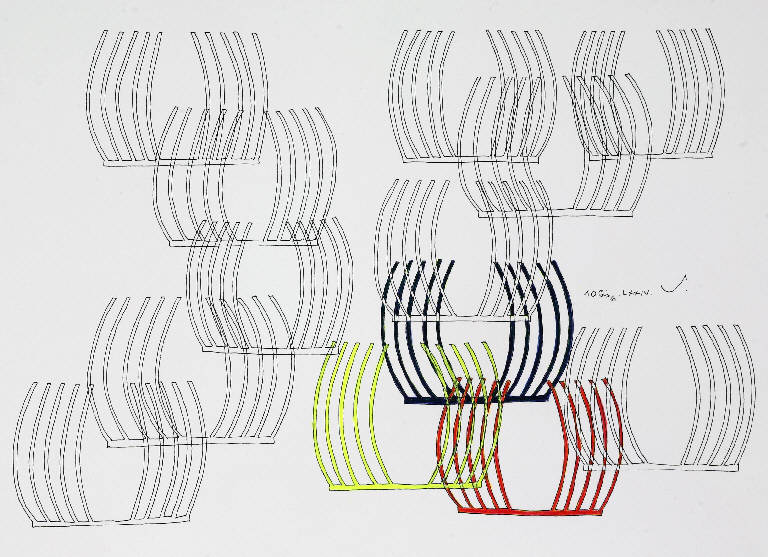 Composizione di tredici forme astratte sovrapposte e curvilinee tre delle quali colorate di blu, giallo fosforecente e rosso.