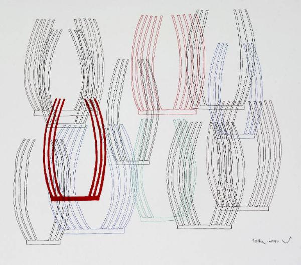 Composizione di dodici forme astratte sovrapposte e curvilinee, una delle quali colorata di rosso.