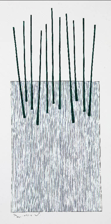 Composizione caratterizzata da un rettangolo con all'interno fitte linee parallele verticali di colore verde, marrone e blu. Sul lato superiore si innestano elementi colorati di verde.