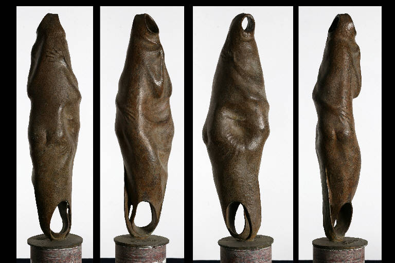 Opera a tutto tondo che rappresenta come racchiuse in un sacco, due figure che si muovono al suo interno. Si intravvedono braccia che simulano un abbraccio, mani giunte e parti anatoniche. Il modellato morbido suggerisce movimento.