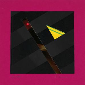 Composizione a collage di forme geometriche: un triangolo giallo e un trapezio irregolare su un quadrato nero su fondo ciclamino.