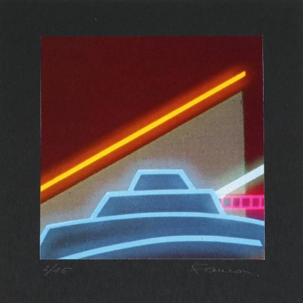 Su un fondo nero un quadrato al centro caratterizzato da una linea gialla in diagonale e linee blu e rosa.