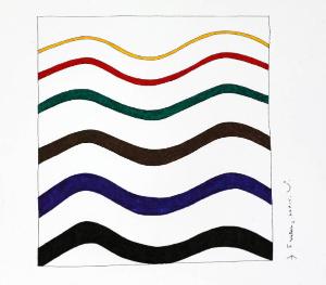 Composizione caratterizzata da un quadrato attraversato da fasce ondulate colorate; la piu' grande di colore nero si trova alla base.