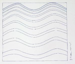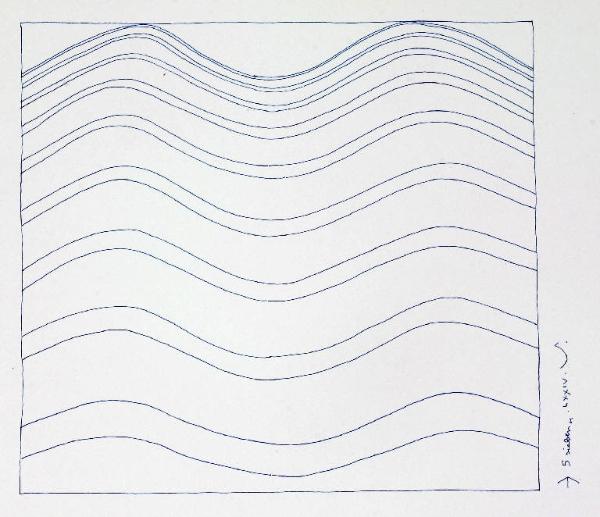 Composizione caratterizzata da un quadrato attraversato da lineee ondulate blu.
