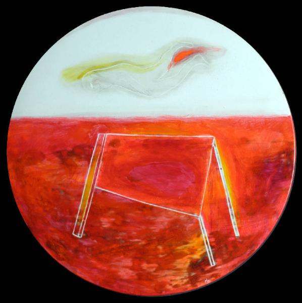 Opera di formato circolare in ceramica che raffigura nella parte inferiore della composizione un tavolo inciso su fondo rosso fosforescente e nella parte superiore bianca un uomo sommariamente graffito che sembra fluttuare nello spazio.
