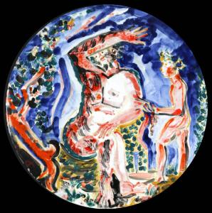 Opera di formato circolare in ceramica policroma raffigurante, al centro dello spazio compositivo, Apollo seduto con le gambe accavallate e il braccio destro alzato e piegato verso il capo; alla sua sinistra una giovane donna nuda di profilo che tende il braccio verso di lui.\n.
