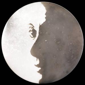 Opera di formato circolare in ceramica che raffigura un profilo di giovane donna raelizzato attraverso giochi di chiaroscuro.