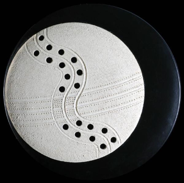Opera di formato circolare in ceramica nera opaca sulla quale è applicata una sfera di terracotta bianca convessa incisa e forata.