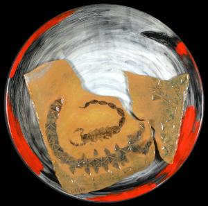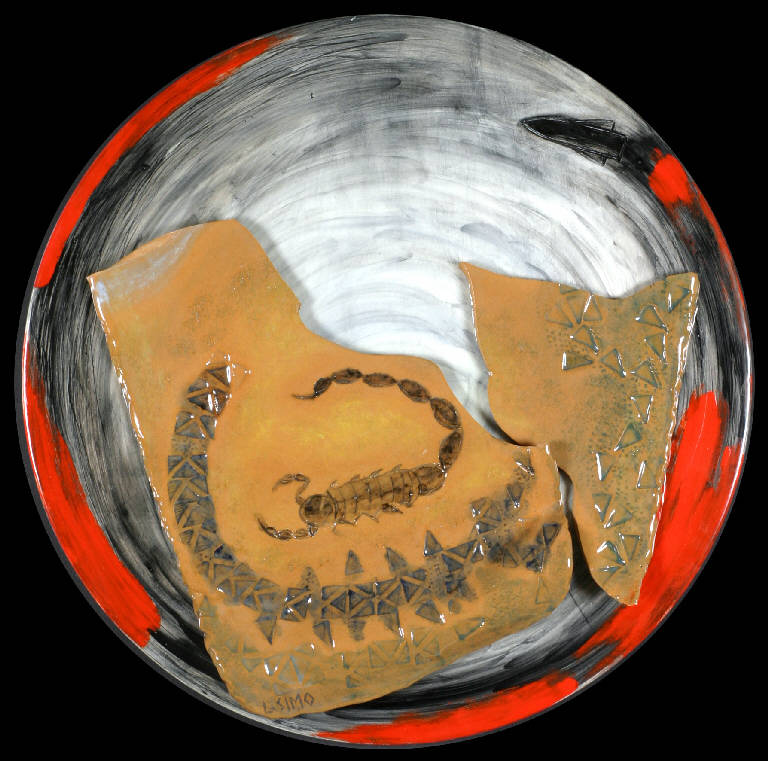 Opera di formato circolare in ceramica dal fondo rosso, nero e bianco caratterizzata dall'applicazione di due elementi in terracotta sopra i quali è inciso uno scorpione.