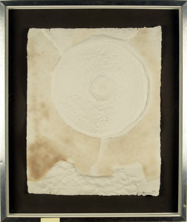 Foglio di cellulosa che presenta un'impronta di forma circolare enfatizzata da segni circolari paralleli intorno ad essa. L'opera acquista un aspetto molto materico.