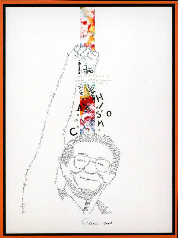 Opera a tecnica mista che ritrae il maestro Luciano Caruso. Il ritratto è eseguito con parole a corsivo a china. Parole, lettere e colori riempiono verso l'alto lo spazio del foglio.
