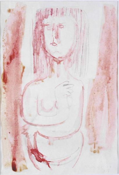 Opera pittorica che rappresenta una donna a mezzo busto. La figura è primitiva nel volto e nelle parti poco proporzionate tra loro. Il corpo è descritto da un tratto rosso. A destra e sinistra della figura si trovano due strisce verticali di colore rosso.