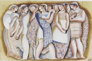 Opera pittorica che rappresenta uomini e donne in gruppo molto ravvicinati. In primo piano al centro una coppia sta ballando. Le figure sono rappresentate con stilemi primitivi. I vestiti semplici e colorati sembrano abiti tradizionali.