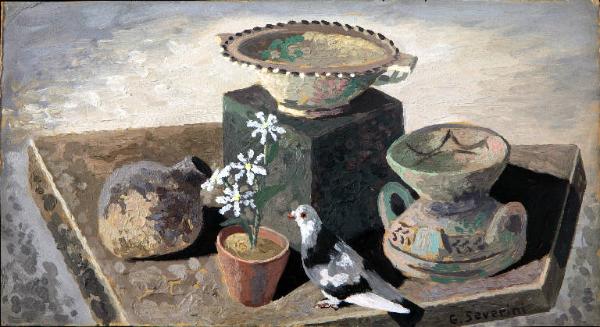 - NOTIZIE STORICO CRITICHE L'opera "La colomba" per analogia cronologica e somiglianza con il soggetto rappresentato può essere confrontata con le seguenti opere:\n- Composizione con colomba, 1924, olio su vetro, 35 x 27 cm\n- Le masque et les pigeons, 1929, tempera su cartone, 62 x 69 cm\n- Piccioni, 1930, china su carta, 18 x 25 cm\n- Piccioni, 1930, china su carta, 18 x 25 cm\n- Composizione (Realtà prese e lontane), 1931, tempera su cartone, 65 x 50 cm\n- Nature morte au balcon, 1933, olio su cartone, 50 x 60 cm\n- Natura morta con pesci e gallo, 1935, tempera su carta intelata, 65 x 106 cm\ntutte pubblicate sul catalogo della mostra Severini, (Genova, Villa Croce, 9 marzo-24 aprile 1988), a cura di Gillo Dorfles e Pier Luigi Siena.