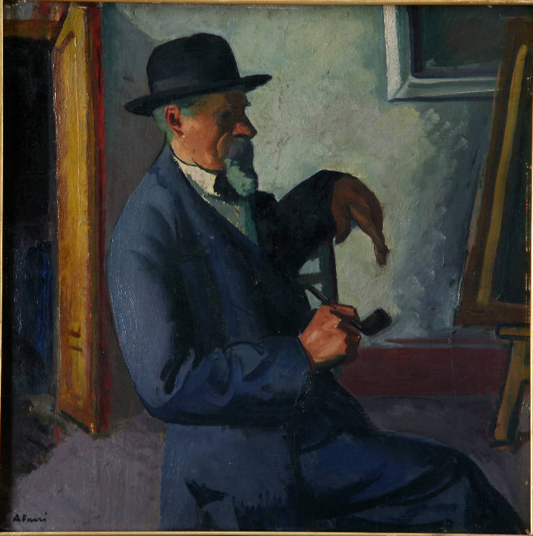 Opera che rappresenta il padre di Achille Funi. La figura del padre si trova al centro di una stanza semivuota in cui si vedono solo un quadro su un cavalletto, uno appeso ad una parete e una porta. Tutti e tre questi elementi sono incompleti e hanno puro valore compositivo. L'uomo, ritratto seduto di tre quarti e intento a fumare la pipa, è colto in un momento di pensosa solitudine, diventando così il simbolo di un ideale umanistico. Il dipinto è costituito da una solida e sintetica struttura. La luce è usata in modo costruttivo, attraverso un gioco di contrasti chiaroscurali. Il colore è materico e denso di luce; la pennellata è morbida e veloce.
