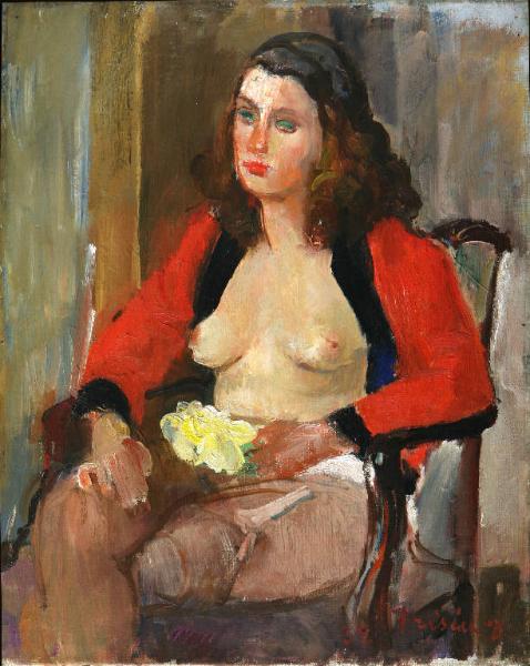 Opera che rappresenta una figura femminile in primo piano, seduta su una sedia. La giovane donna è abbigliata solamente con una vestaglia rossa aperta davanti, calze e reggicalze. Tra le mani stringe una rosa bianca. Ha lo sguardo assorto e malinconico, fisso davanti a sè. Sullo sfondo sembra intravedersi una porta chiusa. La pennellata è veloce e materica; i colori vivi: su tutti spicca il rosso della vestaglia e della bocca della modella.